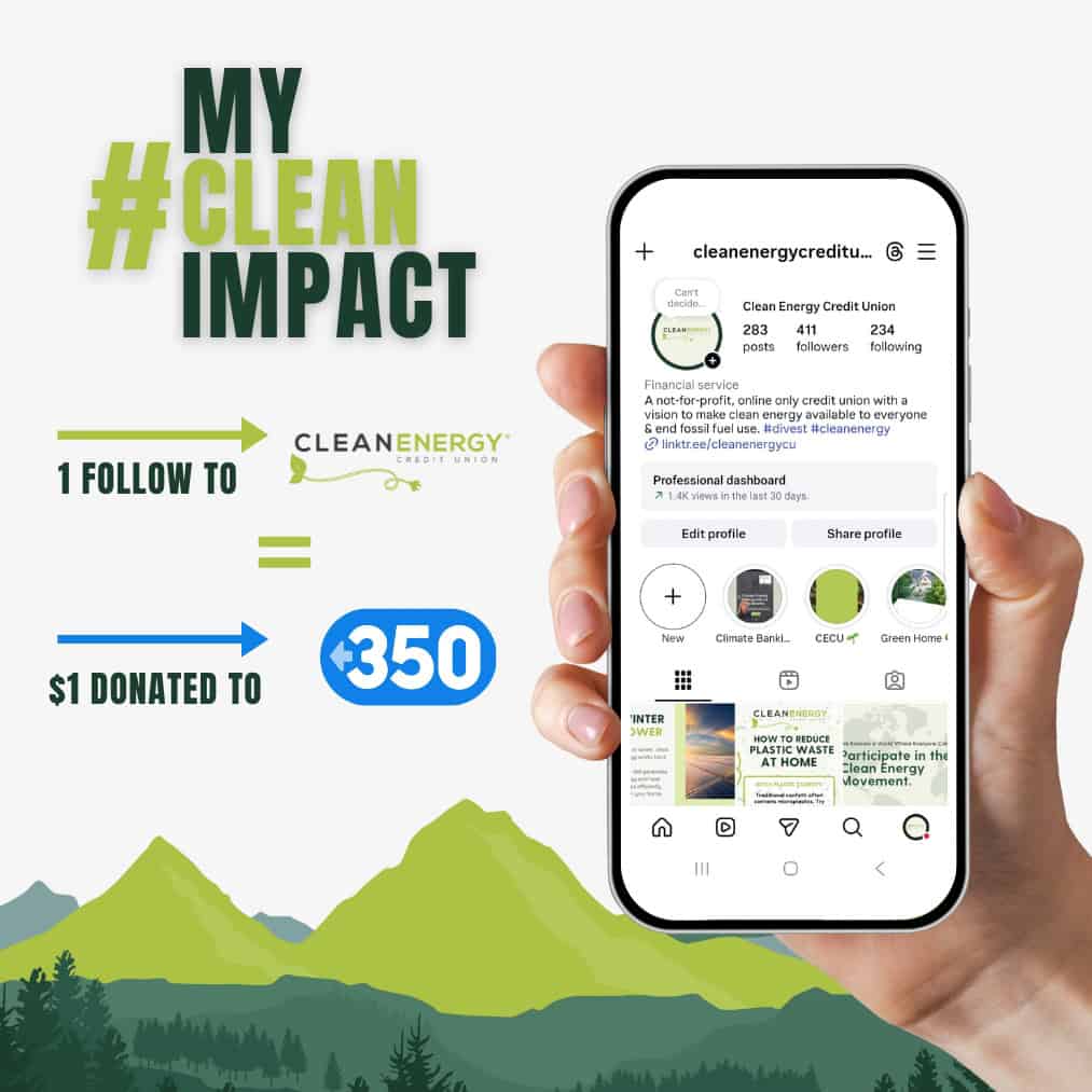 From January 15 through February 27, we are celebrating how our members power clean energy through #MYCLEANIMPACT. When you follow Clean Energy Credit Union during the campaign, we will donate $1 per new follower to 350.org, supporting climate action worldwide.